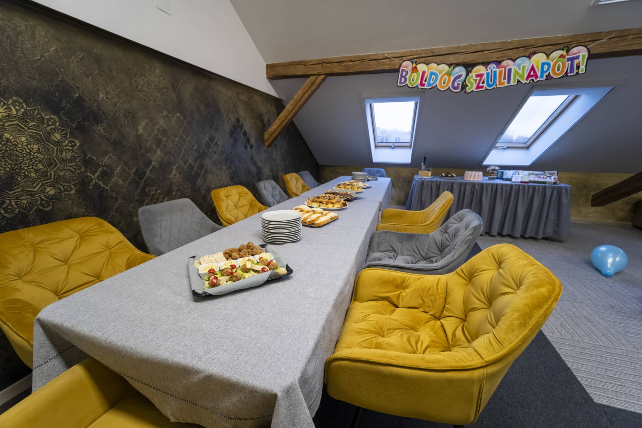 A terem saját mellékhelyiséggel, konyharésszel és társasjáték gyűjteménnyel rendelkezik, így a kényelem, a szórakozás és az exkluzivitás is biztosított. Igény szerint teljes körű étel- és italkínálattal készülünk, legyen szó könnyed falatokról, vacsoráról vagy koktélokról. A kivetítő lehetőséget ad meglepetésvideók vetítésére, fotós összeállításokra, zenelejátszásra, de akár karaoke lehetőséget is biztosítunk igény esetén.